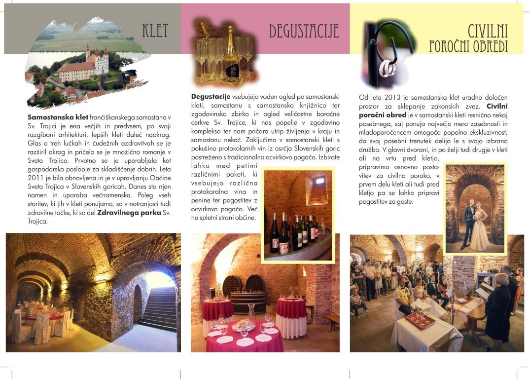 - Degustacije, ki vsebujejo voden ogled po kleti, samostanu in veličastni baročni cerkvi Sv. Trojice, ki nas popelje v zgodovino kompleksa ter nam pričara utrip življenja v kraju in samostanu nekoč, ter pokušino protokolarnih vin iz osrčja Slovenskih goric z tradicionalno ocvirkovo pogačo.